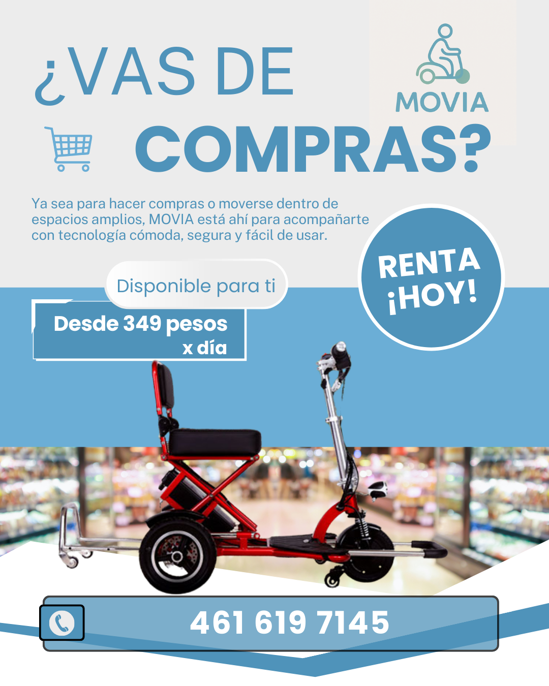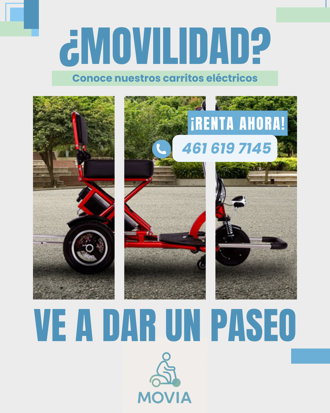 En MOVIA, creemos que la movilidad es sinónimo de libertad. Somos una empresa 100% celayense dedicada a la renta de vehículos eléctricos auxiliares diseñados para adultos mayores o personas que desean mayor comodidad al desplazarse.